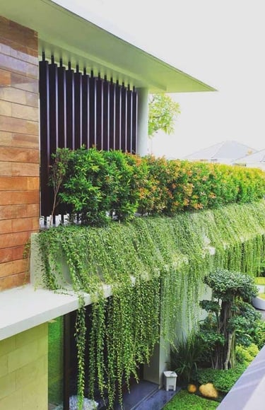 Jardín vertical: Consiste en un diseño para una pared en la que se cuelgan diferentes tipos de plantas, de acuerdo a su tamaño y complejidad, requiere de un sistema de riego especial.